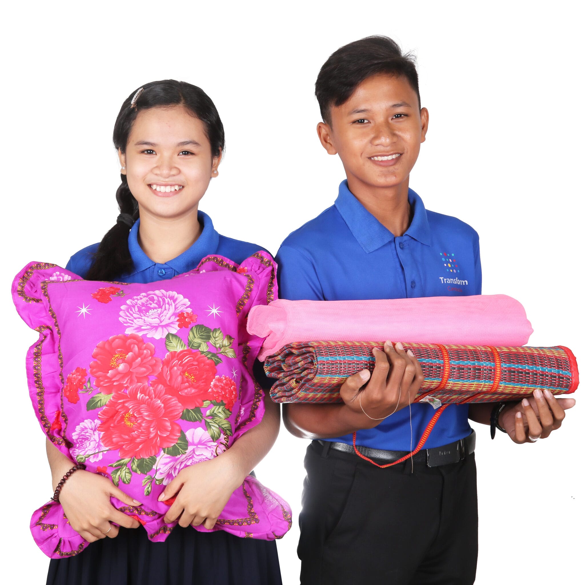 Bed linen set, consisting of a pillowcase, sheets and blanket, in bright, happy colours.
